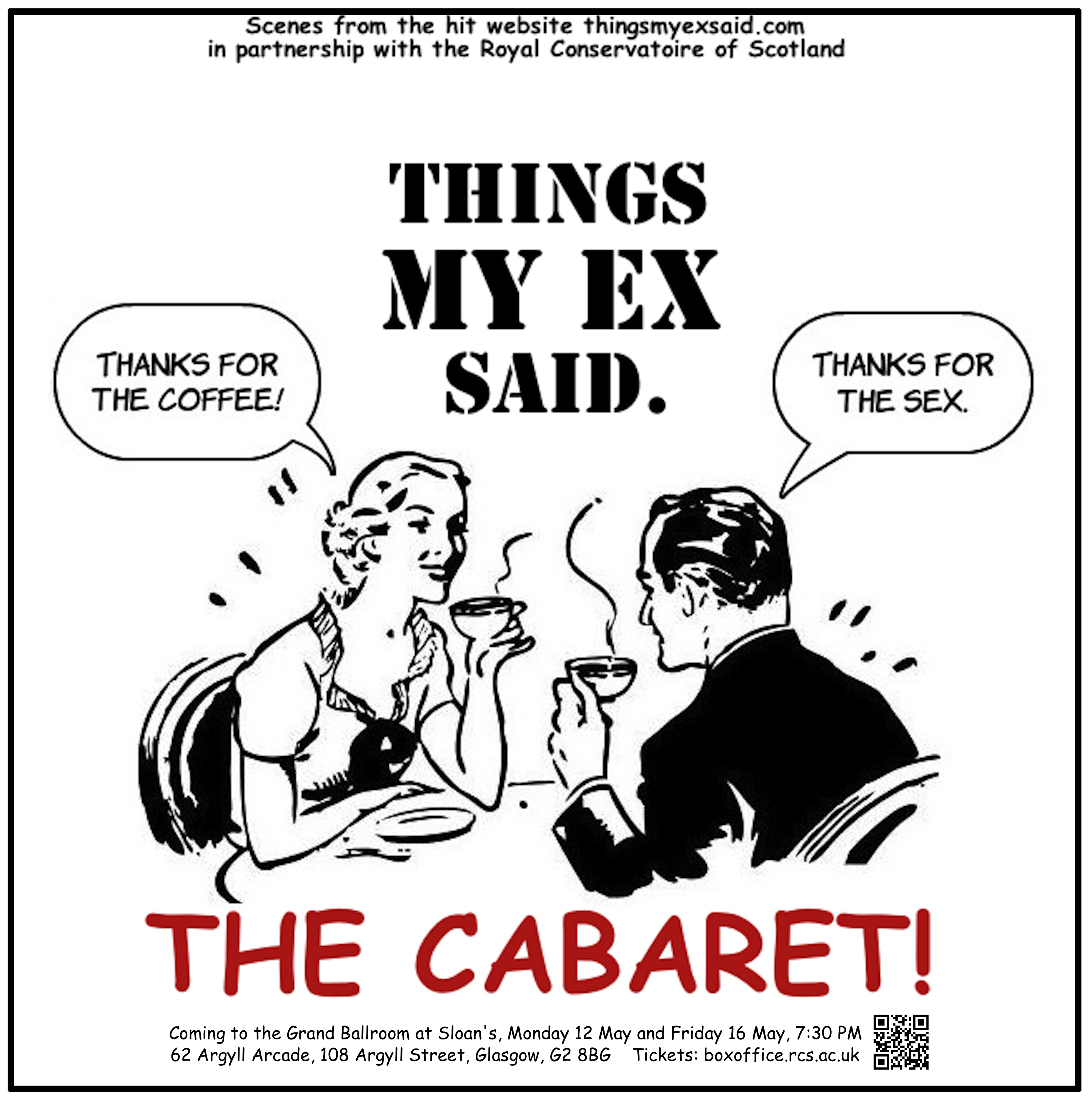 Rehearsals are in full swing for TMXS: the Cabaret, which performs in Glasgow on May 12th and 16th. Stay tuned for more updates! Got a stupid ex? Want to see his or her quote up here in anonymous infamy? Submit your quote to ThingsMyExSaid!