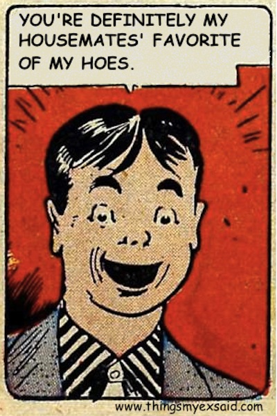 Posted by thingsmyexsaid in Cheating, Common Sense, WTF? Tags: backhanded compliment, cheating, dating, ex-boyfriends, favorite, humor, men, relationships, roommates, surprise, things my ex said, wtf